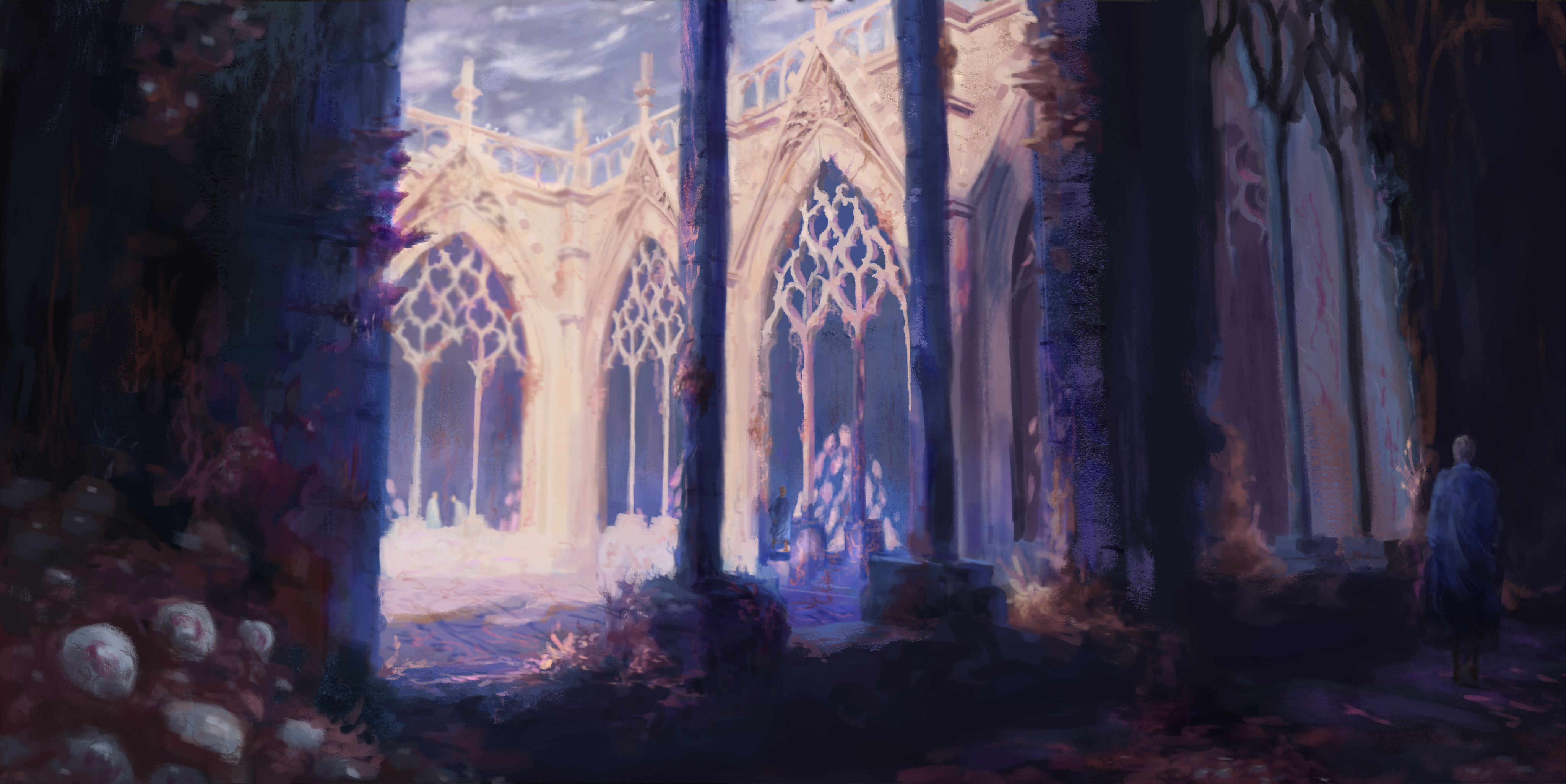 early concept painting of church courtyard